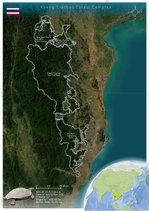 The KKFC is crucial in safeguarding the origins of numerous significant rivers, including the Phetchaburi, Kui Buri, Pranburi, Phachi, and Mae Klong Rivers. Notably, a subset of these rivers served as water sources for the Sam Roi Yod National Park, renowned as a Ramsar Site and celebrated for its abundance of water birds within Thailand. Encompassing an expansive area of 482,225 hectares, the KKFC extends across Ratchaburi, Phetchaburi, and Prachuab Kirikhan. This protected region naturally connects with a forested expanse in Myanmar, with the Tenasserim Ranges forming a natural boundary that spans approximately 292 kilometers from the property's northern edge to its southern limit. Within the KKFC, a diverse array of six distinct forest types thrives, collectively covering 96.43% of the entire landscape. Remarkably, the dry evergreen forest encompasses 59% of the territory. The remaining forest types include Mixed Deciduous forest, Montane Evergreen forest, Moist Evergreen forest, Secondary Forest, and Dry Dipterocarp forest. The area's topography is characterized by its rugged nature, featuring towering mountains in the western portion and undulating hills in the eastern parts. Elevations span from 100 to 1,500 meters above sea level. Climate patterns are influenced by both the north-eastern and south-western monsoon winds. The rainy season generally initiates in mid-May and concludes around mid-October, followed by the winter season extending from mid-October to mid-February, and finally, the dry season prevailing from mid-February to mid-May. The outstanding natural attributes and considerable ecotourism potential have propelled the KKNP into the limelight as a celebrated destination among eco-tourists. However, the region grapples with pressing issues such as land fragmentation, encroachment, illicit hunting, and unauthorized non- timber forest product (NTFP) collection. From a legal perspective, the KKFC complex comprises four officially designated protected areas: the Mae Nam Phachi Wildlife Sanctuary, established under the Wildlife Protection and Preservation Act of 1992, alongside three national parks—Chaloem Phrakiat Thai Prachan, Kaeng Krachan, and Kui Buri—recognized under the National Park Act of 1961. The connection between Kaeng Krachan and Kui Buri National Parks is facilitated by the Kui Buri Forest Reserve and the Army Reserve Zone, governed respectively by the Forest Reserve Act of 1964 and the Military Reserve Zone Act of 1935. The KKFC spans an extensive area, functioning as a guardian of the region's overall ecological equilibrium, including its exceptional wildlife values. Moreover, it safeguards the forests that play an integral role in the watershed of Petchaburi and Prajuab Kirikhan provinces. The administrative structure comprises a Unit Superintendent at the helm, supported by deputy officials assigned to each component. Additionally, a network of patrol stations strategically situated within and around the boundaries carries out consistent enforcement and outreach activities, ensuring the preservation and protection of this significant ecological enclave.
